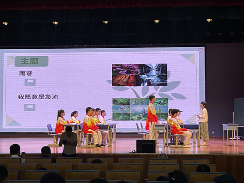下午的觀摩活動為三場公共基礎(chǔ)課展示。第一場是韓庭彥老師的語文課《詩二首:雨巷 我愿意是急流》。韓老師帶領(lǐng)學(xué)生對兩首詩歌進行反復(fù)誦讀,讓學(xué)生從“音樂美”、“意境美”、“情感美”三個角度感受詩歌的魅力。