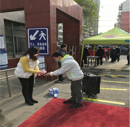 入校后,學生在報到處出示學生承諾書、健康登記表、致家長的一封信,由報到處老師檢查確認。檢查無誤后,報到處老師將學生引入各班班級,再次檢測體溫、洗手消毒。在班級門口,學生保持一米距離,上交三表,各班班主任對學生進行相關防疫知識宣傳,隨后引導學生進入宿舍樓。
