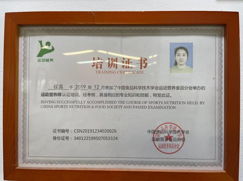 同年,2019年12月參加了中國食品科學(xué)技術(shù)學(xué)會運動營養(yǎng)食品分會舉辦的運動營養(yǎng)師認(rèn)證培訓(xùn)。