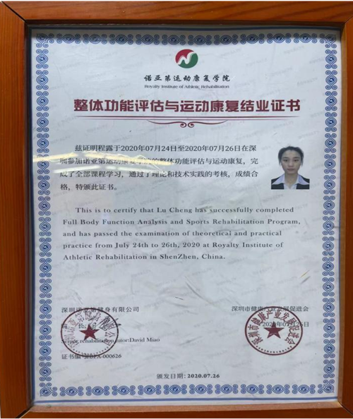 同年,2020年7月在諾亞第運動康復(fù)學(xué)院學(xué)習(xí):整體功能評估與運動康復(fù)學(xué)課。完成全部課程,通過理論和技術(shù)實踐考核。