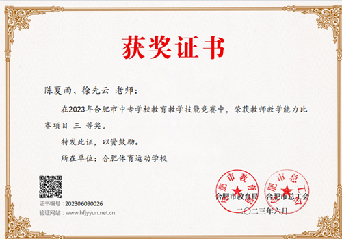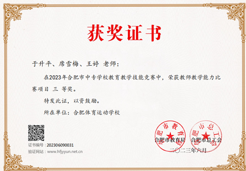 2023年合肥市中職學(xué)校教育教學(xué)技能大賽及班主任業(yè)務(wù)能力比賽對(duì)我校而言意義重大,在時(shí)間緊任務(wù)重的條件下,分管教學(xué)副校長(zhǎng)陳燕毅然決定我校要組隊(duì)參賽,雖然時(shí)間緊迫,困難重重,但我們體育教育者最不怕的就是面對(duì)困難、戰(zhàn)勝困難!在校領(lǐng)導(dǎo)的鼓勵(lì)和支持下,經(jīng)過(guò)學(xué)校選拔,由數(shù)學(xué)教研組、英語(yǔ)教研組和班主任董志老師參加比賽。經(jīng)過(guò)比賽文件學(xué)習(xí)、組隊(duì)研習(xí)商討、特邀專家培訓(xùn)、錄制參賽作品、修訂相關(guān)材料等步驟,學(xué)校各參賽團(tuán)隊(duì)在較短的時(shí)間內(nèi)按要求上傳了參賽作品,經(jīng)過(guò)專家評(píng)選,參賽作品均喜獲三等獎(jiǎng)。