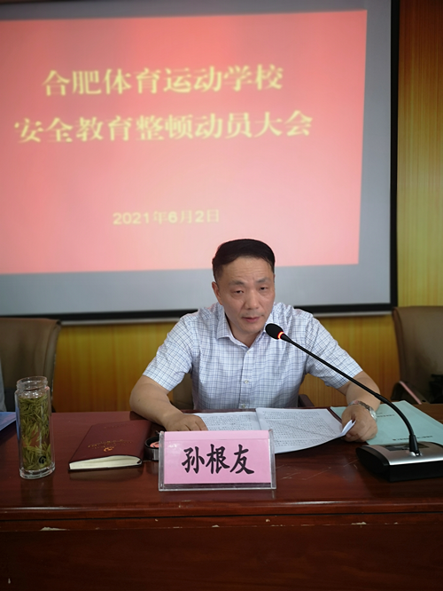 為認真貫徹習近平總書記關(guān)于安全工作一系列批示指示精神,認真貫徹落實國家體育總局、省市體育行政部門有關(guān)會議精神,全面梳理排查學校存在的各種隱患苗頭,牢牢守住安全發(fā)展底線,防范化解好各類矛盾風險,保障師生身心健康和生命安全,維護學校和諧穩(wěn)定,為學校健康持續(xù)發(fā)展營造安全穩(wěn)定的良好環(huán)境,在合肥市體育局安全教育工作小組的督查指導下,6月2日下午兩點四十分,學校召開安全教育整頓動員大會,應到參會57人,實到參會57人,1人遲到。市體育局黨組成員、副局長孫根友,市體育局機關(guān)紀委書記葉輝,市駐文廣新局紀檢檢查組宋巍,市體育局競訓處主任葛偉,市體育局人事處主任江峻榮,市體育局辦公室副主任陳鵬出席會議。會議由校黨支部書記陳瑛主持,孫根友副局長發(fā)表重要講話。