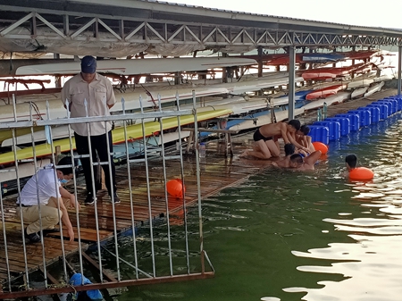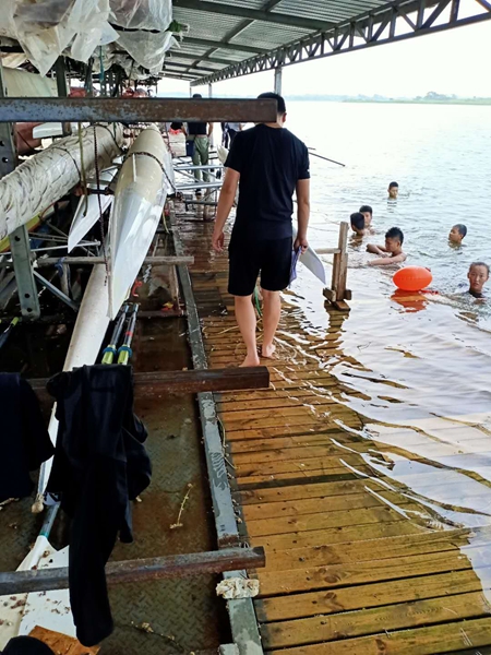 下午4點(diǎn),工作人員來(lái)到訓(xùn)練碼頭,因長(zhǎng)期水泡,訓(xùn)練碼頭下沉,部分碼頭有溢水現(xiàn)象。工作人員克服困難,對(duì)訓(xùn)練舟艇、槳等訓(xùn)練器材進(jìn)行清點(diǎn)。