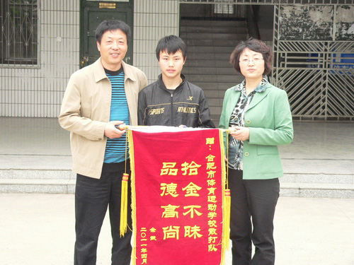 上周五,失主來到我校,向我校校長表示感謝,感謝學(xué)校培養(yǎng)出品德高尚、學(xué)訓(xùn)兼優(yōu)的學(xué)生,并送上錦旗,上面閃著金色大字“拾金不昧,品德高尚”!