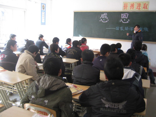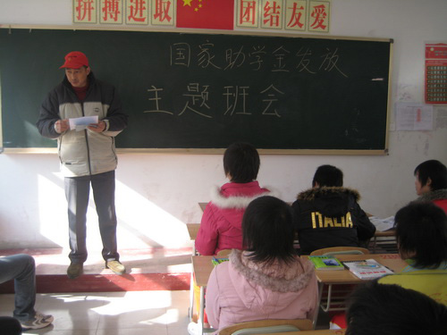 班主任正在召開主題班會,宣講國家助學(xué)金政策。