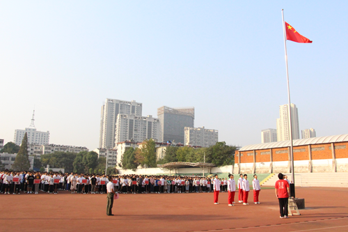 在主持人“升國旗、奏國歌,師生齊唱國歌”的口令發(fā)出后,全場肅立,面向國旗行注目禮,高聲齊唱國歌。