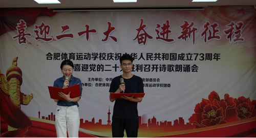 為慶祝國(guó)慶佳節(jié),喜迎二十大的勝利召開(kāi),進(jìn)一步豐富黨員文化生活、師生校園文化生活,9月30日下午中共合肥體育運(yùn)動(dòng)學(xué)校黨支部組織全體黨員、教師、團(tuán)員、學(xué)生代表在階梯教室隆重舉行“喜迎二十大,奮進(jìn)新征程”主題朗誦活動(dòng)。
