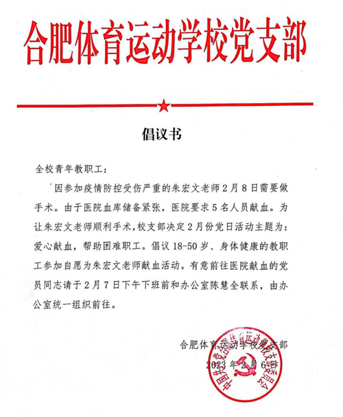 中共合肥體育運(yùn)動(dòng)學(xué)校二月份黨日活動(dòng)——愛心獻(xiàn)血,幫助困難職工