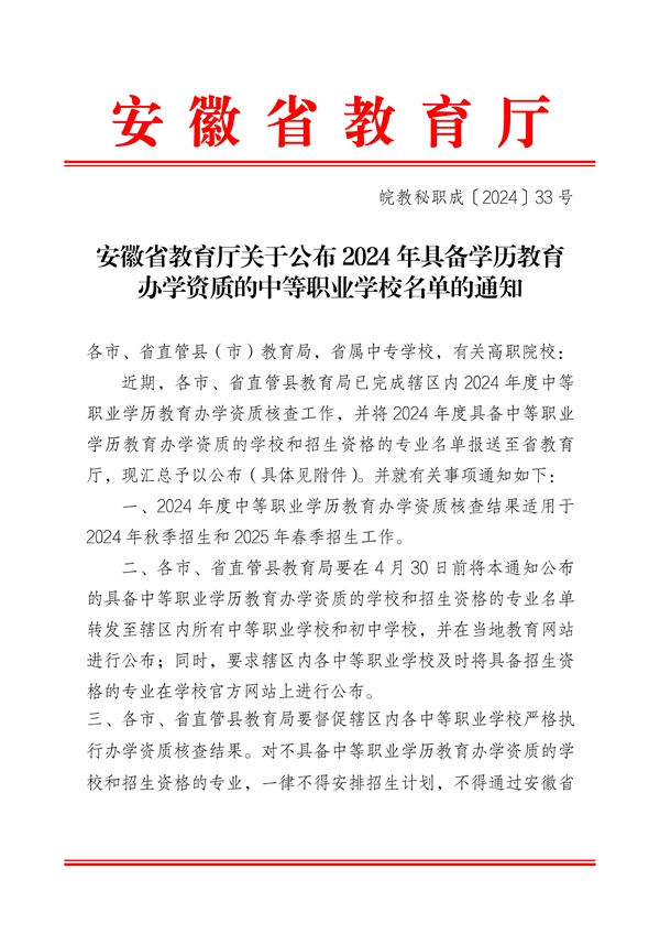 附件:安徽省2024年具備中等職業(yè)學(xué)歷教育辦學(xué)資質(zhì)學(xué)校和招生資格專業(yè)名單