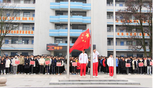 3月6日早晨8點,全校師生齊聚教學樓前廣場,隆重舉行新學期第一次升旗儀式。精神抖擻、英姿颯爽的國旗護衛(wèi)隊,邁著鏗鏘有力的步伐護送著鮮艷的五星紅旗進場,伴隨著嘹亮的國歌響起,五星紅旗冉冉升起,全體師生肅立,面向國旗行禮。