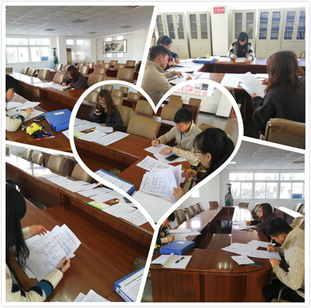 下午,英語教研組老師們齊聚在會(huì)議室,集體批閱同學(xué)們的答卷。