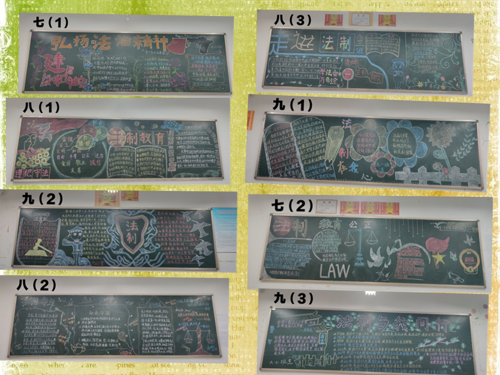 活動(dòng)中,各班精心準(zhǔn)備,通過(guò)閱覽書報(bào)、上網(wǎng)查詢等多渠道搜集整理有關(guān)法制方面的資料,設(shè)計(jì)了一幅幅圖文并茂、設(shè)計(jì)新穎、布局合理的黑板報(bào)。其中七(1)班、八(1)班和九(2)班三個(gè)班喜獲第一名,九(3)班、八(3)班和九(1)班榮獲第二名,七(2)班和八(2)班并列第三名。