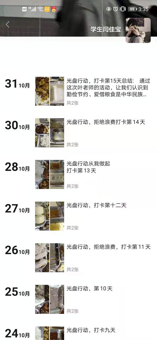 自從學(xué)校發(fā)布通知以后,班級連續(xù)召開幾次班會,帶領(lǐng)大家學(xué)習(xí)此次活動的主要內(nèi)容,決定開展打卡14天的活動來踐行光盤行動。活動發(fā)起后,班級學(xué)生踴躍參加,積極參與打卡活動。本次活動是每天在微信朋友圈開展,學(xué)生在三餐后拍照上圖?;顒娱_展以后,學(xué)生浪費(fèi)現(xiàn)象得到極大的改善,收到家長、老師、教練的稱贊。