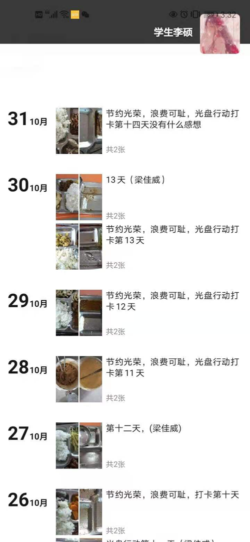 自從學(xué)校發(fā)布通知以后,班級連續(xù)召開幾次班會,帶領(lǐng)大家學(xué)習(xí)此次活動的主要內(nèi)容,決定開展打卡14天的活動來踐行光盤行動?;顒影l(fā)起后,班級學(xué)生踴躍參加,積極參與打卡活動。本次活動是每天在微信朋友圈開展,學(xué)生在三餐后拍照上圖?;顒娱_展以后,學(xué)生浪費(fèi)現(xiàn)象得到極大的改善,收到家長、老師、教練的稱贊。