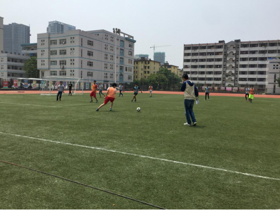 上午10:30,雙方運動員準時上場,比賽開始,由程付教練擔任這次比賽的裁判員,雙方球員很快進入角色,進攻浪潮接連不斷。開局十分鐘,14(3)班丁劉率先破門進球,1:0領(lǐng)先。14(2)班在落后一球的情況下,立即組織隊員展開猛烈攻勢,加大了進攻的力度,多次造成14(3)班后防壓力。隨著比賽時間推移,14(3)班隊員陳康,發(fā)揮優(yōu)異,在隊友的配合下,連進兩球,3:0繼續(xù)領(lǐng)先。此時雙方球員的體力都出現(xiàn)了嚴重透支,在離比賽結(jié)束還有10分鐘,14(3)班組織完成進球攻勢,以一記進球圓滿完成結(jié)束了這次比賽,最終把比分鎖定在4:0.