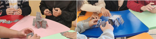 活動(dòng)第二項(xiàng),同學(xué)們分成兩組共同使用卡牌搭建“高塔”,比拼哪一組搭建的“高塔”更高。在活動(dòng)中,一組的同學(xué)先各自搭建“高塔”,在搭建過程中與組內(nèi)的同學(xué)們交流經(jīng)驗(yàn),最終共同搭建起又高又穩(wěn)定的“高塔”;二組同學(xué)剛開始一起團(tuán)隊(duì)合作,但屢次失敗,轉(zhuǎn)而獨(dú)自嘗試探索不同的結(jié)構(gòu)方式,最終大家共同創(chuàng)造出來一個(gè)更高、更穩(wěn)定的結(jié)構(gòu)。在這個(gè)過程中,同學(xué)們體驗(yàn)到了失敗,也感受到了大家共同合作的力量。相互交流、傳遞經(jīng)驗(yàn),使我們能夠更好更快的實(shí)現(xiàn)目標(biāo)。