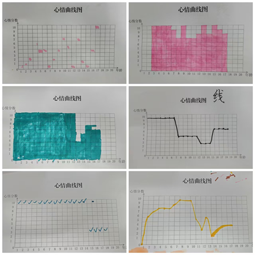 活動(dòng)第三項(xiàng),同學(xué)們自由創(chuàng)作人生心情曲線圖,可以使用折線圖的方式,也可以畫格子,并且使用不同顏色來表達(dá)自己不同的情感。同學(xué)們回顧自己的曾經(jīng)的生活,最終認(rèn)真的在圖上記錄自己的感受。大家完成之后,老師邀請大家一起分享不同人生階段中印象最深刻、最快樂或者挫折事件,在分享的過程中,大家重溫了溫暖的記憶,也回憶了曾經(jīng)感到痛苦的事情。通過這項(xiàng)活動(dòng),同學(xué)們感知到了自己的成長,體會到了生活的起伏,學(xué)會了珍惜當(dāng)下。