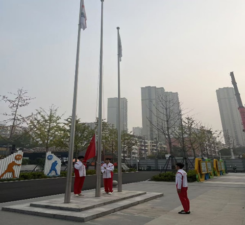 上午8點,升旗儀式開始,在雄壯的國歌聲中,五星紅旗冉冉升起,全體師生向國旗敬禮。