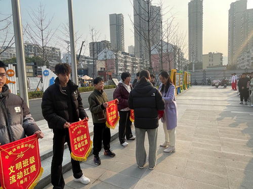 升旗儀式第三項(xiàng),公布2月獲得文明班級(jí)和文明寢室名單,陳燕副校長(zhǎng)為獲獎(jiǎng)班級(jí)頒發(fā)流動(dòng)紅旗。