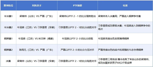 在決賽中,面對(duì)實(shí)力強(qiáng)勁的對(duì)手,刁李星君絲毫沒有畏懼,依然保持平常心態(tài)。他巧妙地運(yùn)用戰(zhàn)術(shù),不斷尋找對(duì)手的破綻,抓住時(shí)機(jī)果斷出擊,最終以2比1擊敗山東名將、巴黎奧運(yùn)會(huì)季軍梁育帥。