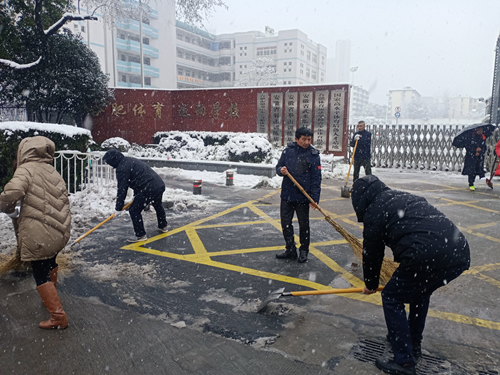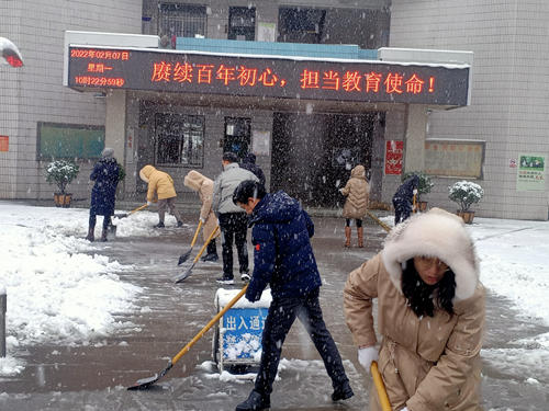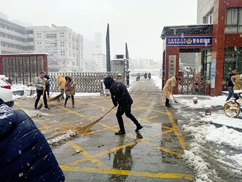 正月初七,新年伊始,恰逢瑞雪,一夜之間,校園銀裝素裹。上班第一天,校黨支部積極響應號召,帶領各部門工作人員,冒著嚴寒,清掃積雪,保證校園秩序,確保生產安全。