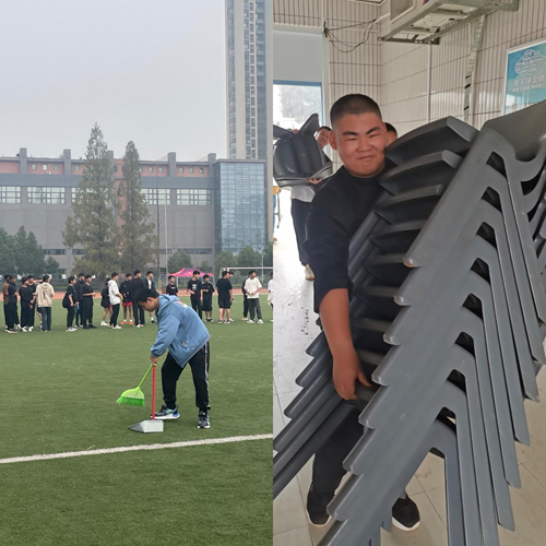 運動會閉幕后,學(xué)生們陸續(xù)離開操場。王昊同學(xué)看著操場上遺留下的零星垃圾,自愿留在操場,拿起掃把和簸箕,將垃圾一一清掃。黃金偉同學(xué)將工作人員使用的椅子高高摞起,主動搬起沉重的椅子,往返于操場和教室之間。他們用自己的實際行動為學(xué)校運動會的后勤工作貢獻了自己的力量。